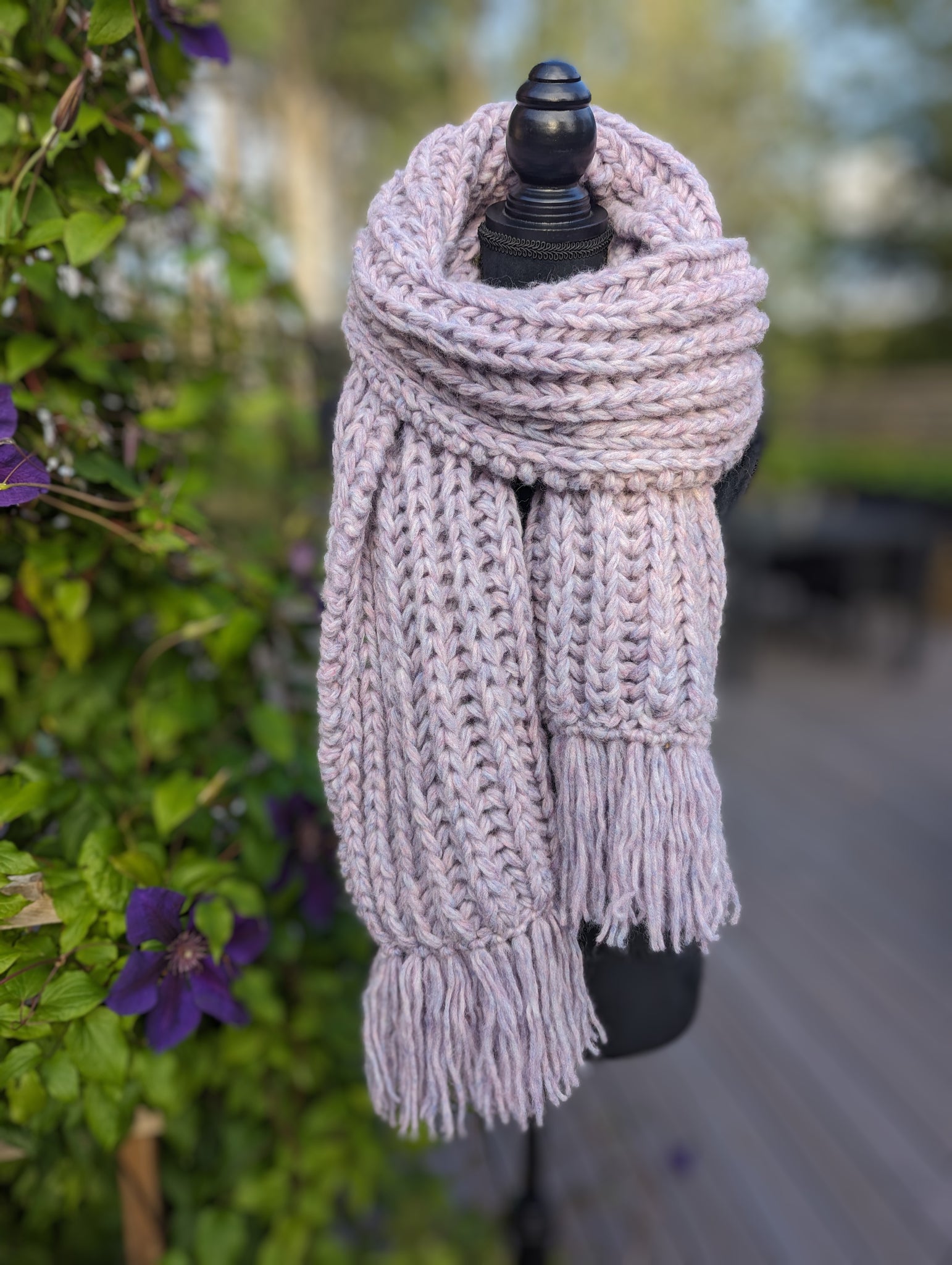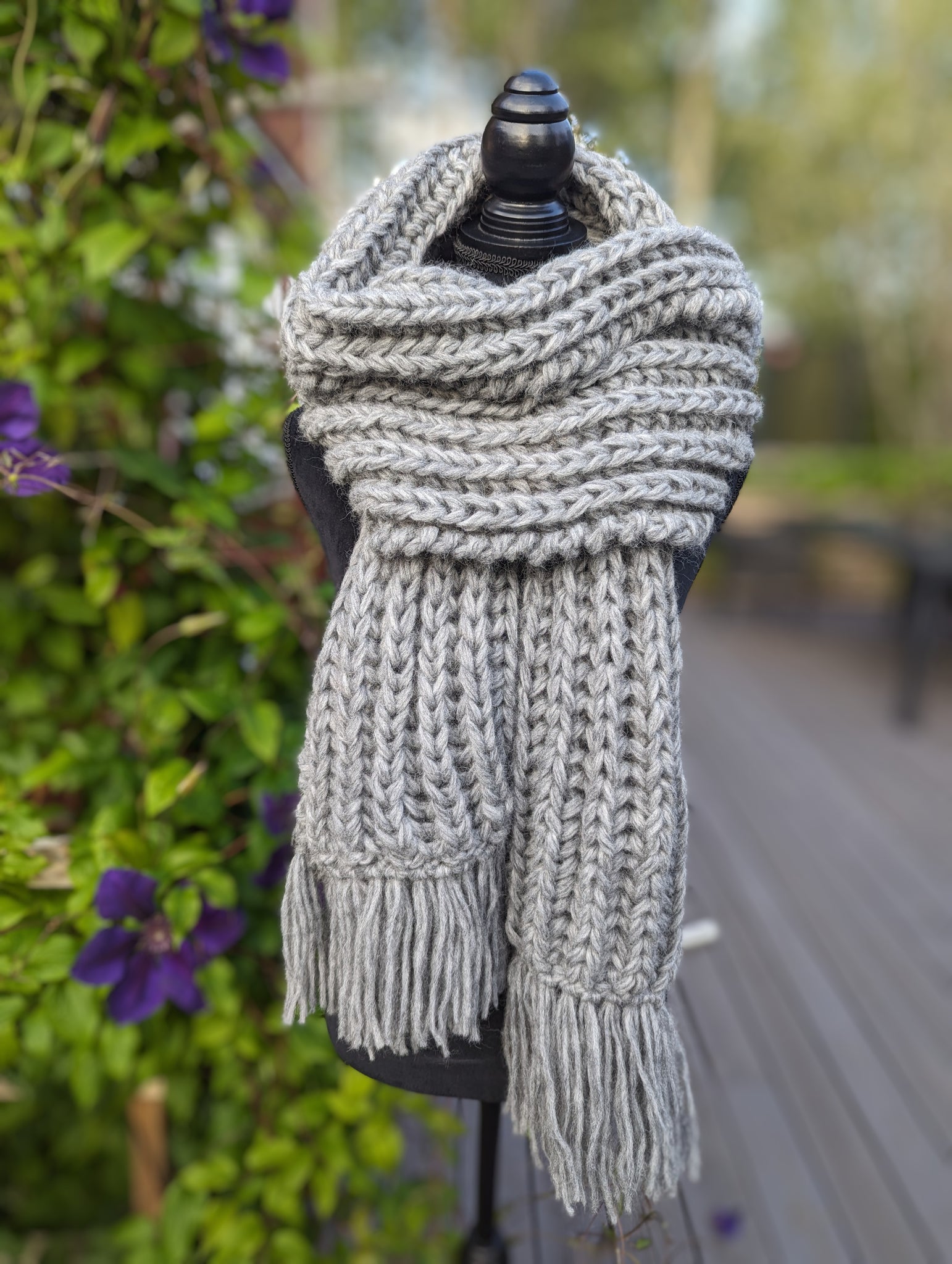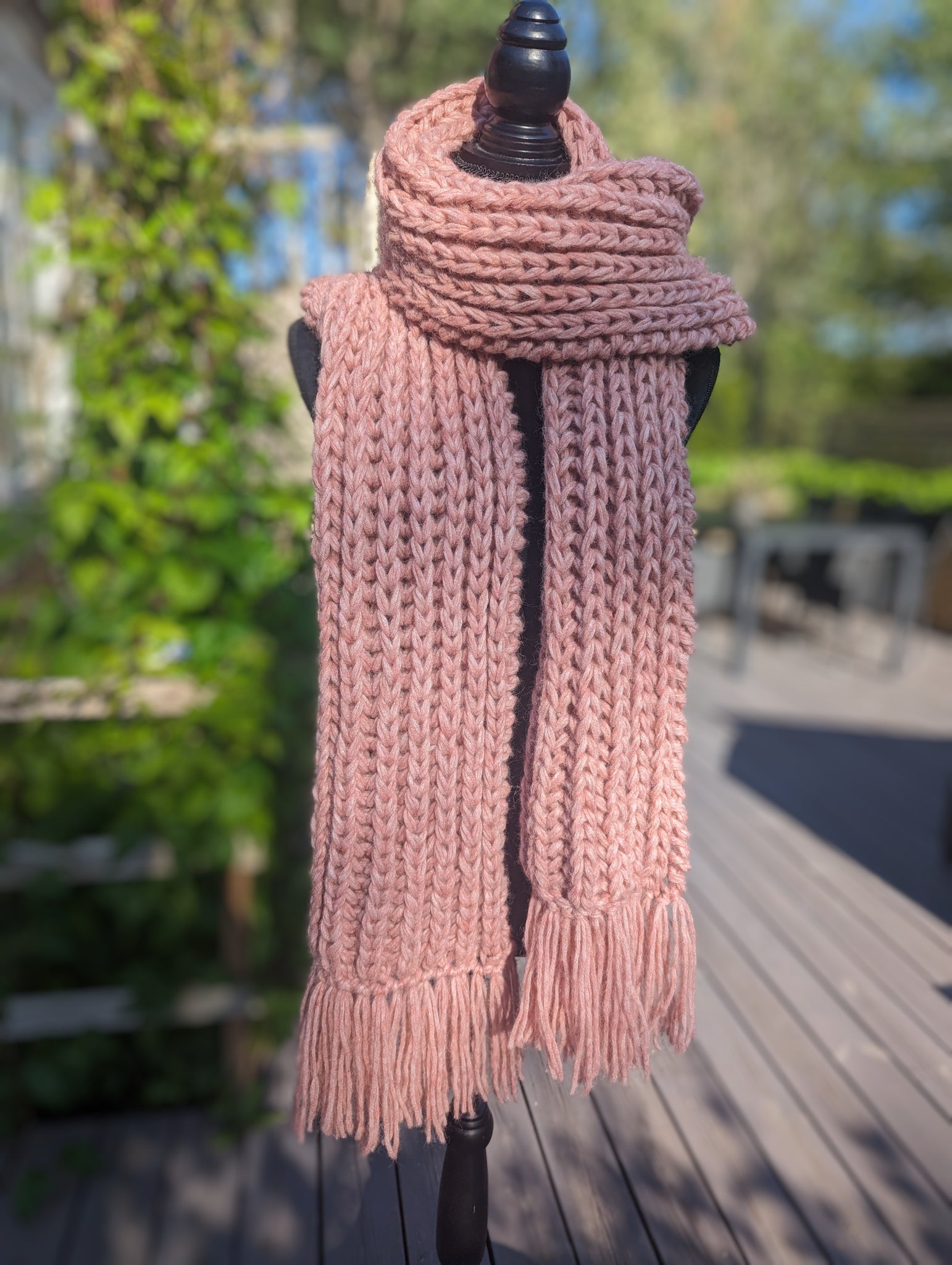 Herlig, mykt og varmt skjerf! Strikkes i helpatent uten kast, forklaring står i oppskrift. Garn som er brukt er Viking Alpaca Bris eller Drops Air. Strikkes med 3 tråder på pinne 15, så dette strikkes raskt!