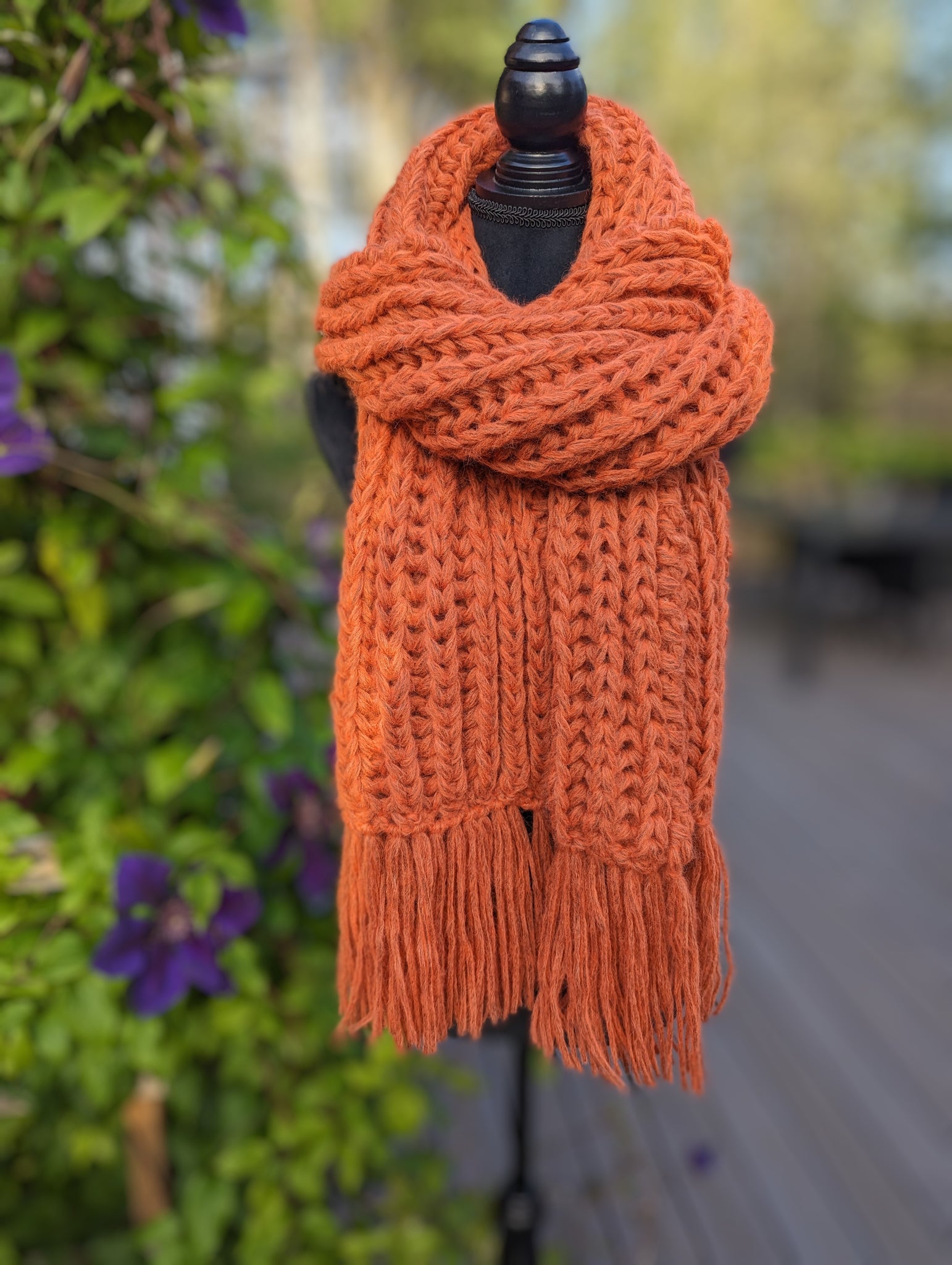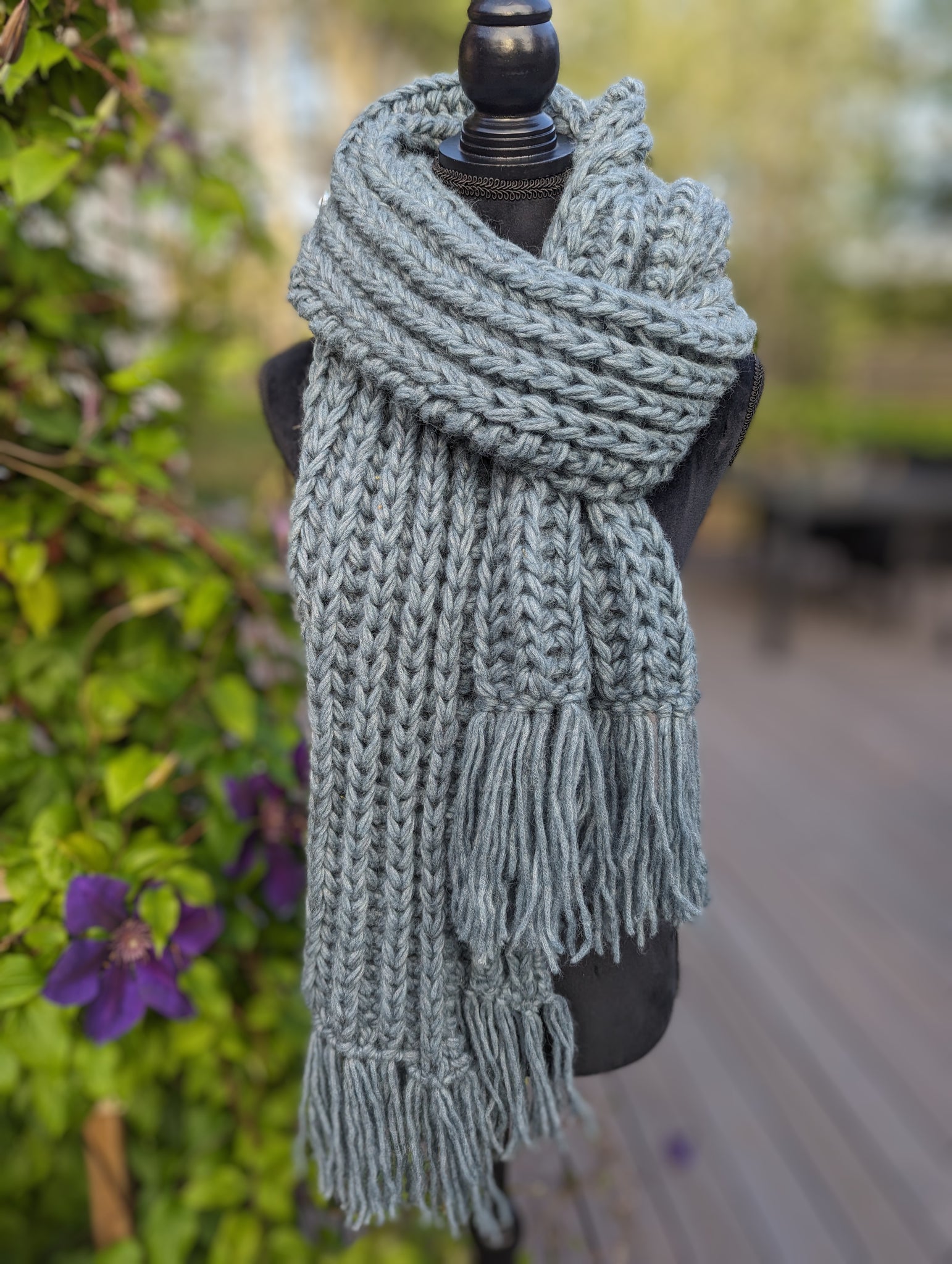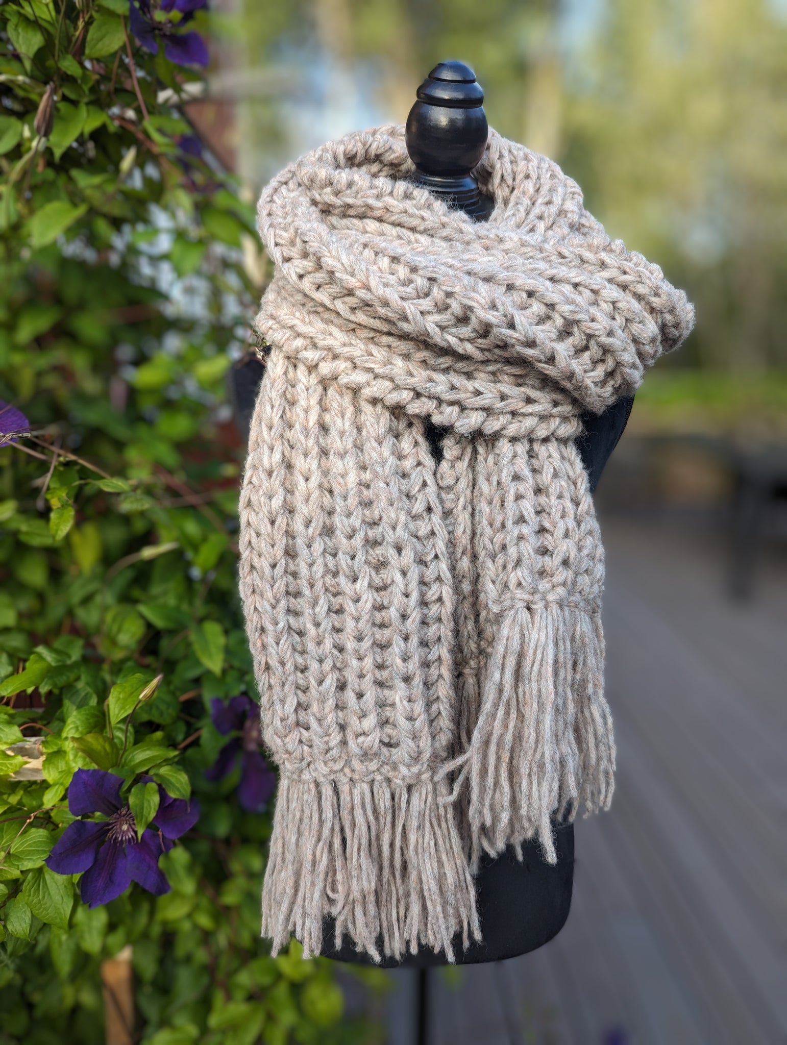 Herlig, mykt og varmt skjerf! Strikkes i helpatent uten kast, forklaring står i oppskrift. Garn som er brukt er Viking Alpaca Bris eller Drops Air. Strikkes med 3 tråder på pinne 15, så dette strikkes raskt!